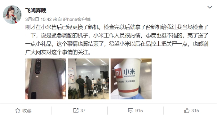 而在次日,該網友也PO出了小米的處理過程,表示小米官方在檢查這款手機之後,就幫他換了新機。不過最後他還是表示,希望小米以後在品質控管上把關嚴謹一點,不要有類似的「機王」出現。