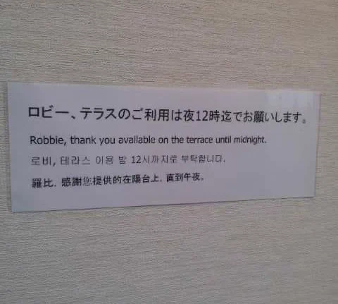 翻譯成他國語言後,意思竟變成「羅比,感謝您提供的在陽台上,直到午夜」,誤將大廳譯為人名「羅比」,從英文來看,更是變成像是叮嚀「羅比」這個人的專屬告示。日本網友紛紛在貼文表示,「只有羅比被點名了!」、「羅比限定的告示」、「羅比以外的人24小時都可以使用」。